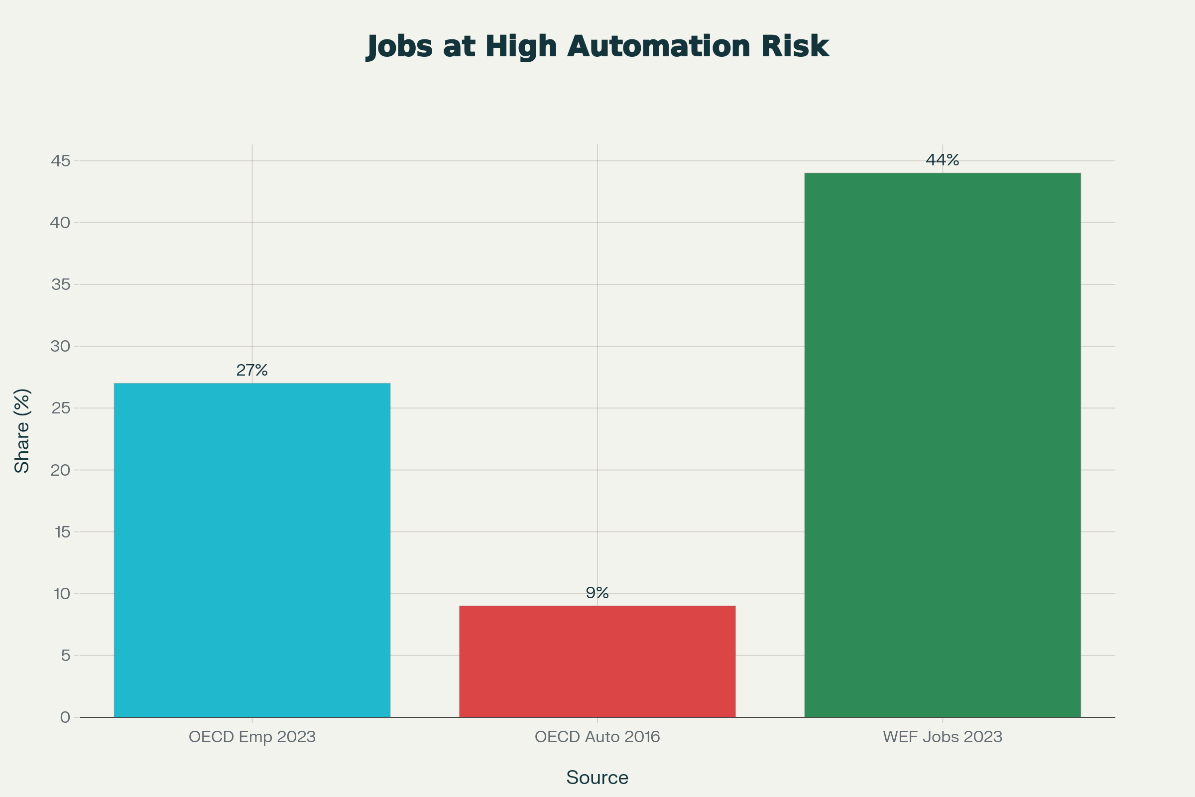 - The OECD’s 2023 Employment Outlook and subsequent briefings estimate that jobs with a high risk of automation—defined as those where more than a quarter of required skills are easily automatable—account for about 27–28% of jobs on average across OECD countries.